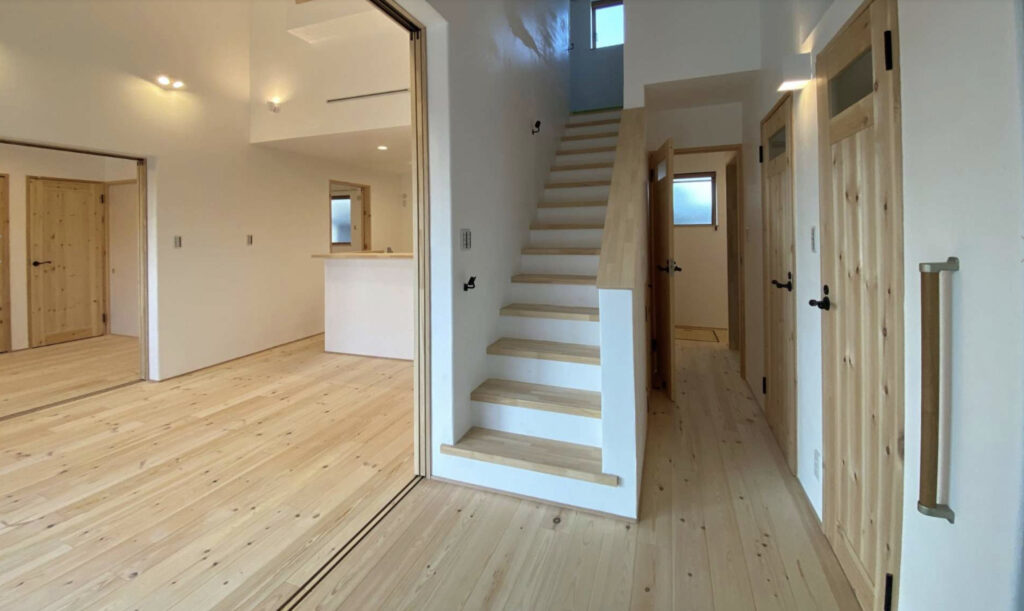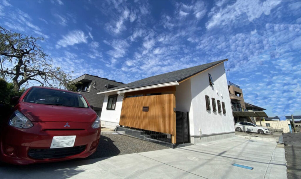 常滑市の海の見える高台にあります。お施主様がこだわった大きな土間と片流れの屋根が特徴です。